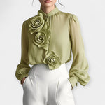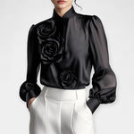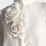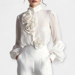 Αυτή η λευκή μπλούζα με εντυπωσιακές 3D εφαρμογές σε σχήμα τριαντάφυλλου αναβαθμίζει το στυλ σου με μια νότα ρομαντισμού και πολυτέλειας. Ο ψηλός γιακάς και το διακριτικά διάφανο ύφασμα χαρίζουν μια αέρινη, εκλεπτυσμένη σιλουέτα, ιδανική για συνδυασμό με tailored παντελόνια ή φούστες.