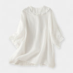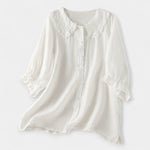Ένα παιχνιδιάρικο πουκάμισο από ανάλαφρο μείγμα βαμβακιού και λίνου που συνδυάζει κομψότητα και άνεση. Ο γιακάς Peter Pan με βολάν προσθέτει μοναδική λεπτομέρεια που αναβαθμίζει κάθε casual εμφάνιση, ιδανικό για φούστες ή παντελόνες.