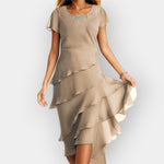 Με ανάλαφρες στρώσεις σιφόν και ρευστή γραμμή, αυτό το φόρεμα αποπνέει διακριτική πολυτέλεια και κομψότητα. Ιδανικό για βραδινές εμφανίσεις και ιδιαίτερες περιστάσεις, προσφέρει άνεση χωρίς να χάνει το εκλεπτυσμένο του ύφος.
