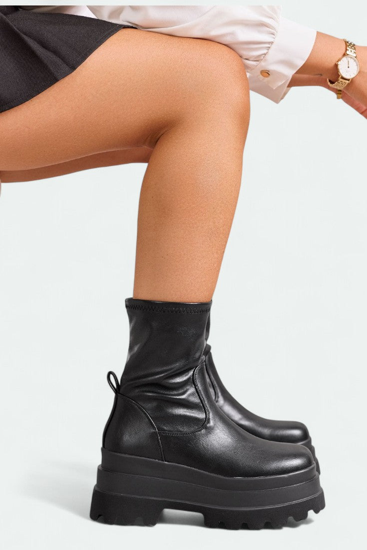 Μινιμαλιστικά αλλά με χαρακτήρα! Τα μποτάκια από οικολογικό μαύρο δέρμα με ελαστικό καλάμι αγκαλιάζουν τον αστράγαλο σαν κάλτσα, ενώ η chunky πλατφόρμα προσφέρει ώθηση και στυλ σε κάθε βήμα. Ιδανικά με φούστες ή σορτς. 🖤👢